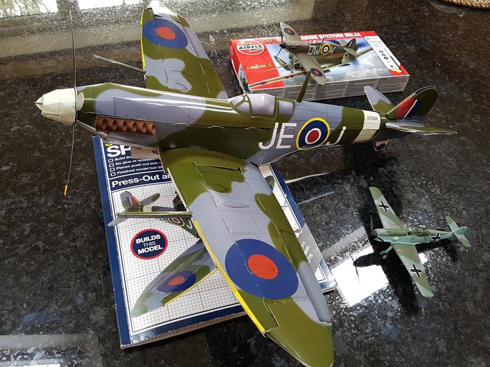 After the Airfix plastic model of the Spitfire he continued by making first a Messerschmitt bf 109 and then another Supermarine Spitfire, a much bigger cardboard model.