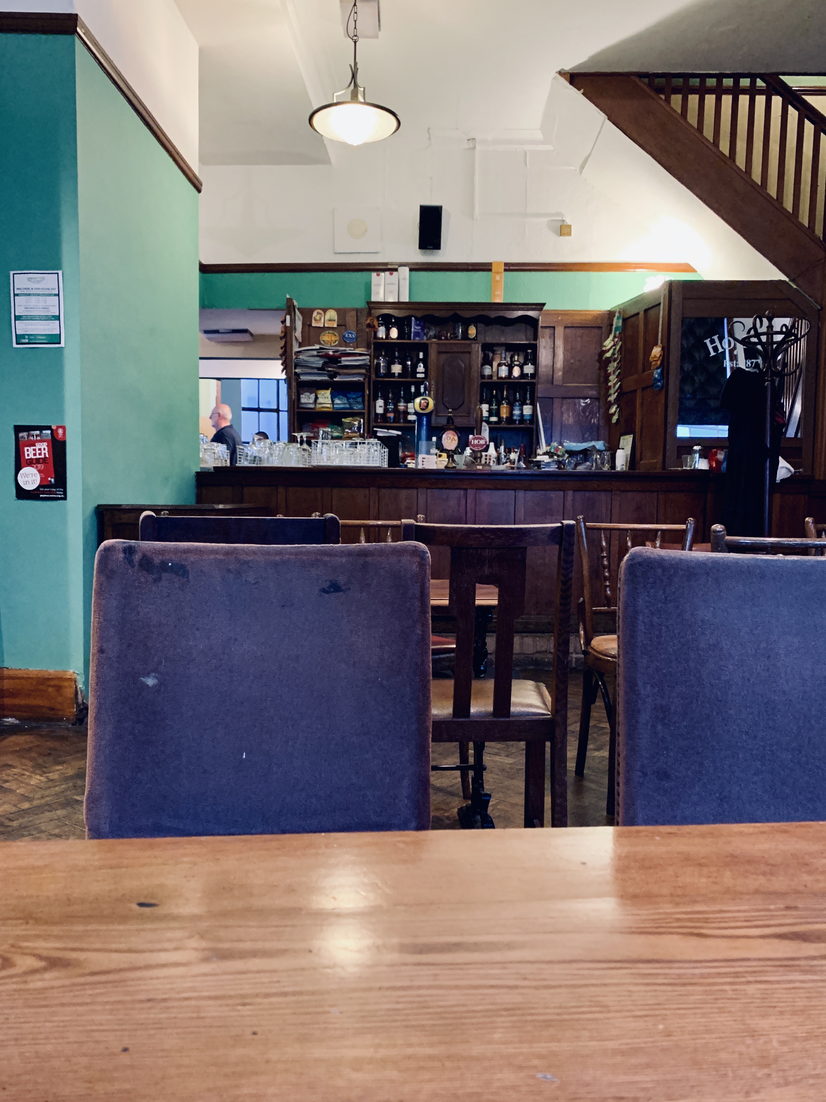 Inside the Ale Wagon, Leicester. The atmosphere is dead and this at half past nine on a Friday night. There is a small clique of older aged regulars by the bar in the adjoining room. They match the stained and scuffed material of the pub chairs.