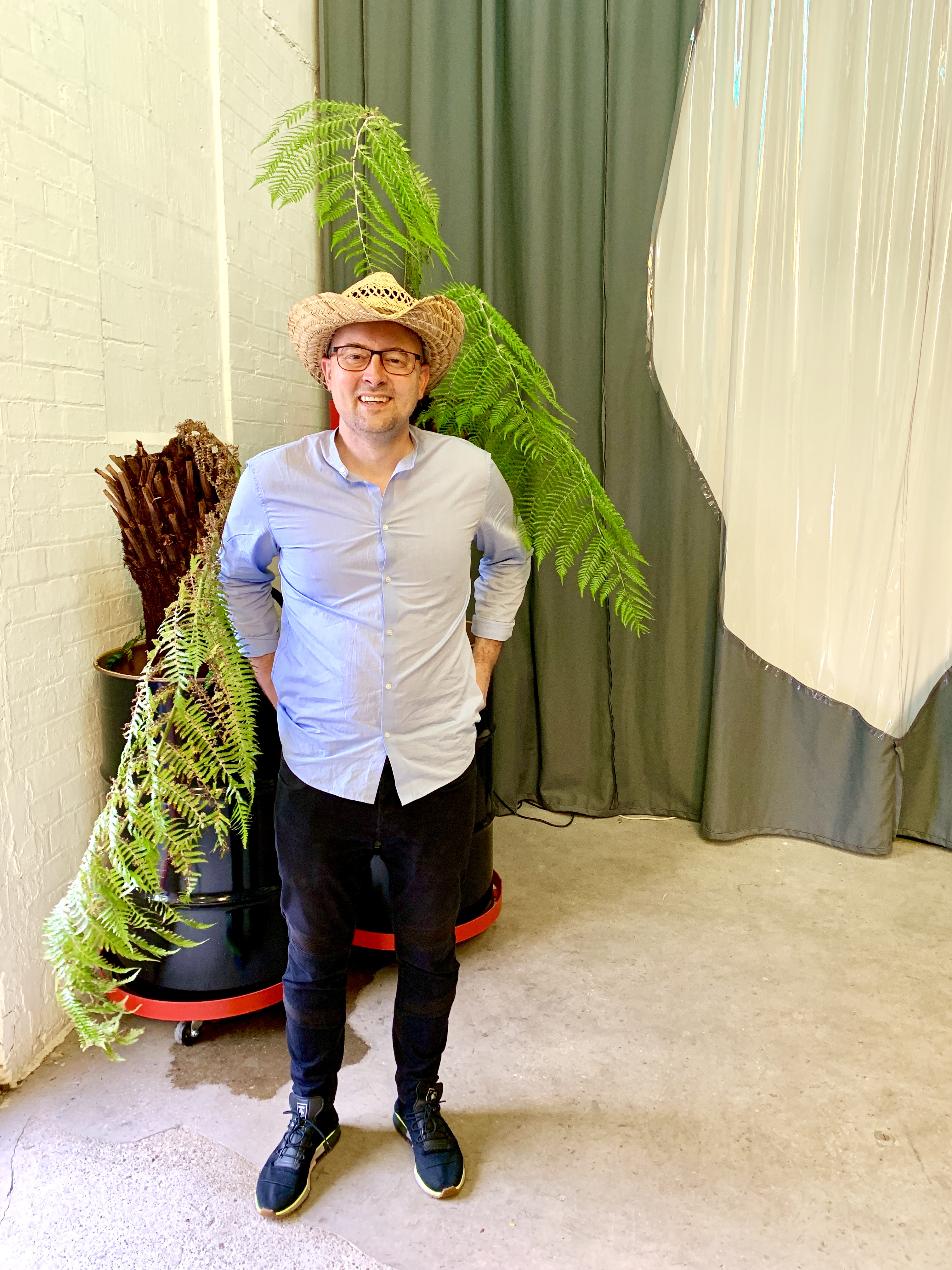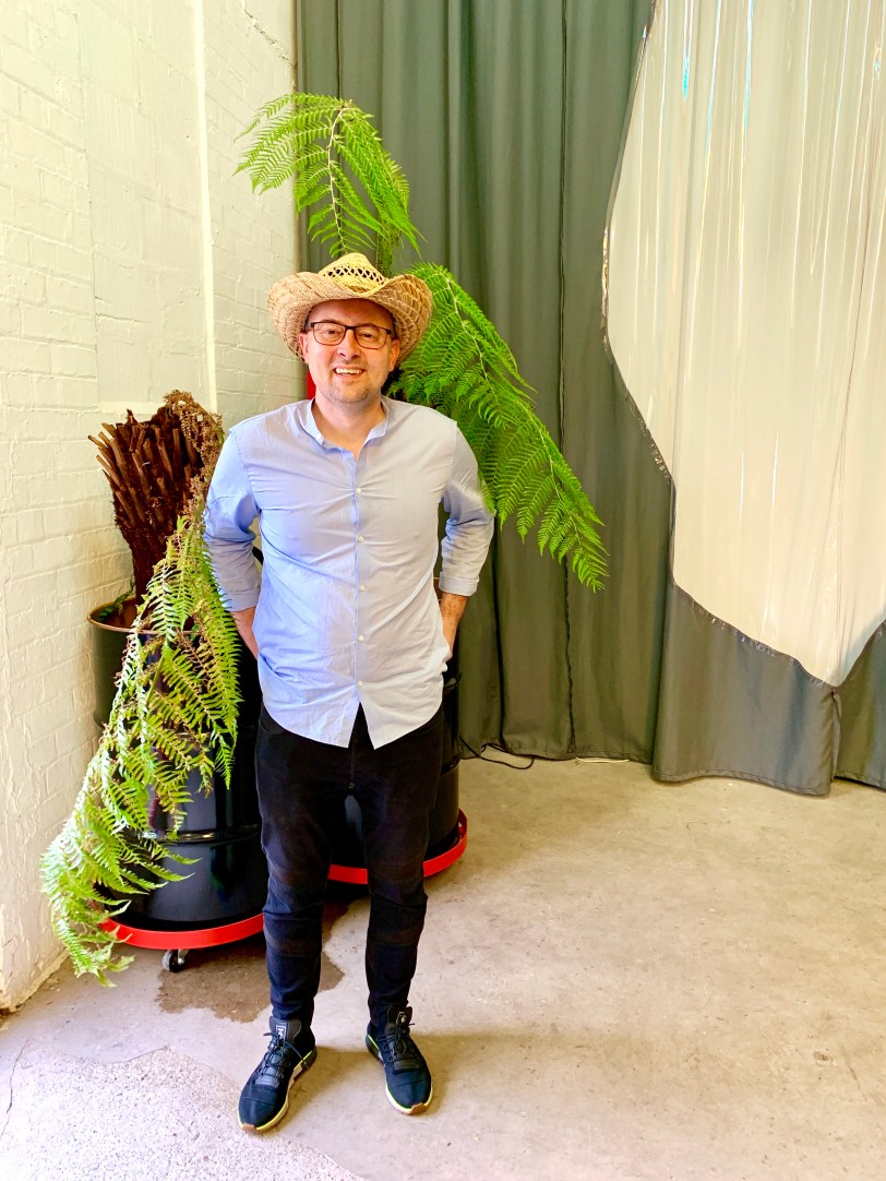Artist Curator Gavin Wade at Eastside Projects in Birmingham, UK just before the reading of The Inner Ring Road in Monster Chetwynd’s ‘Hell Mouth 3’
