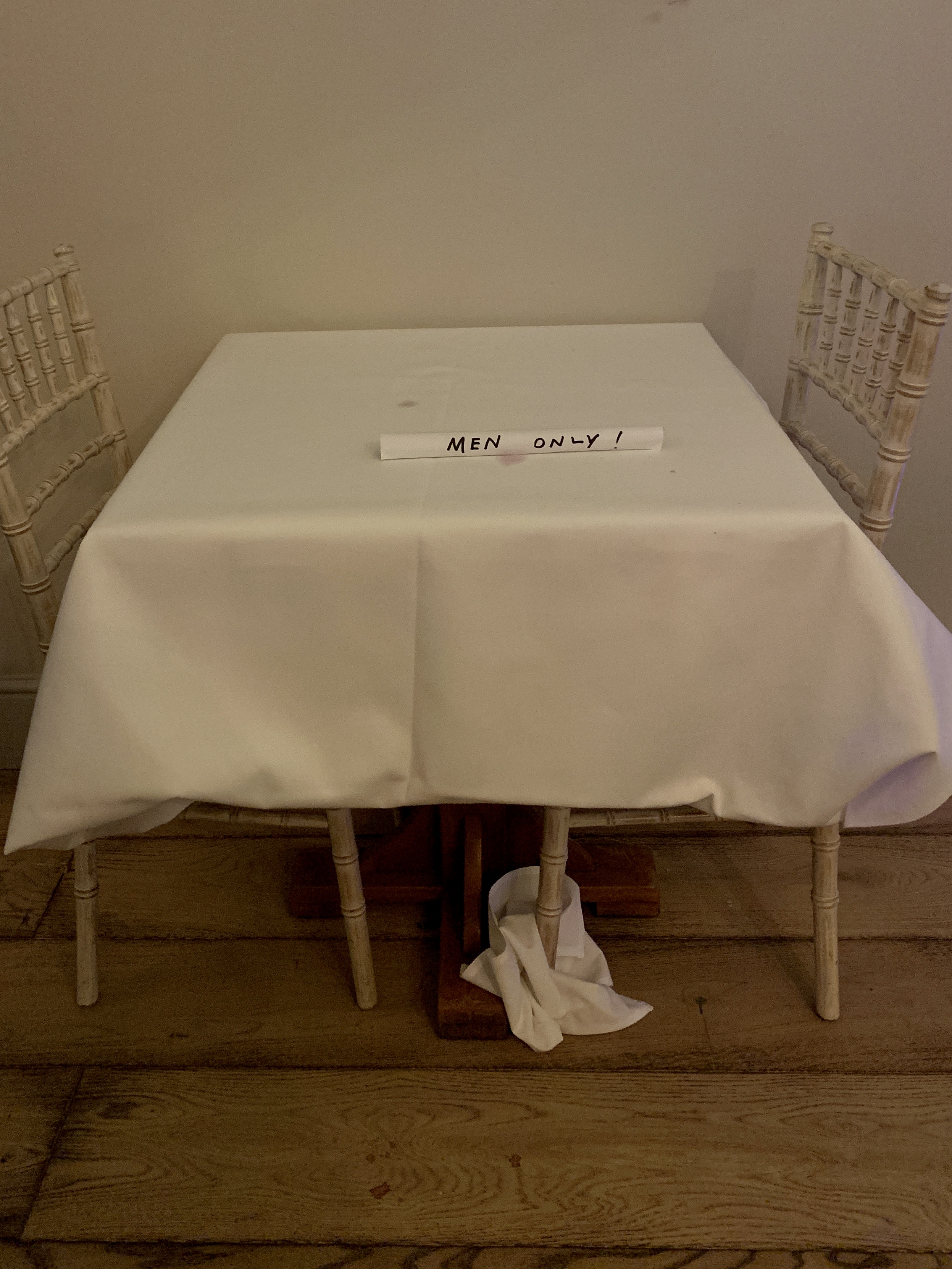 Maybe this hand written sign is for something entirely different. Found here on this restaurant table for two it has a certain feeling about it.