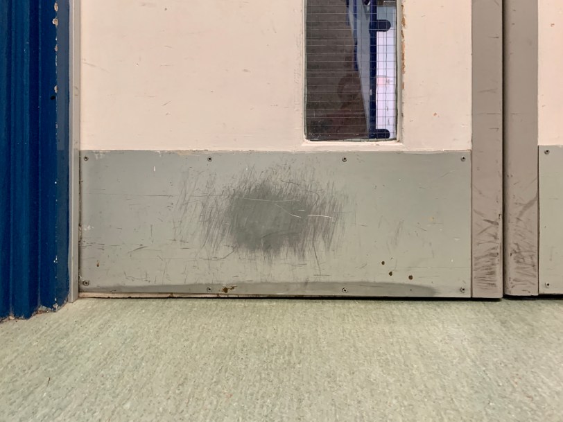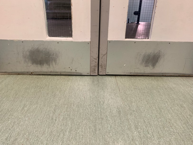 Swing doors. Look at the bottom of swing doors today. They are a rich source of involuntary paintings. The constant kicking by walkers eager to pass through to the other side, here from the main body of the Royal Hallamshire Hospital into the stairway. Beautiful collaborative ever changing boot toe, shoe toe drawings.