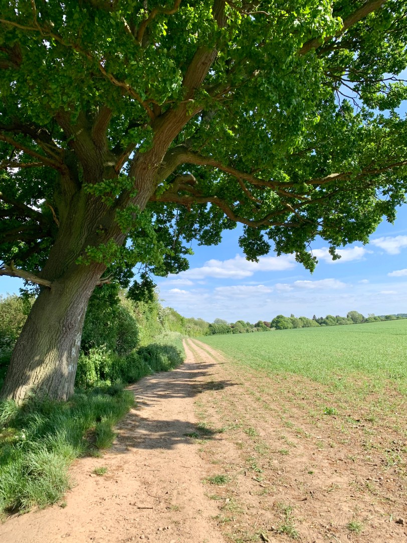 Photograph: an oak tree by a field of sprouting barley on the urban edge of Loughbohemia (some call it Loughborough) UK – Paul Conneally May 2020