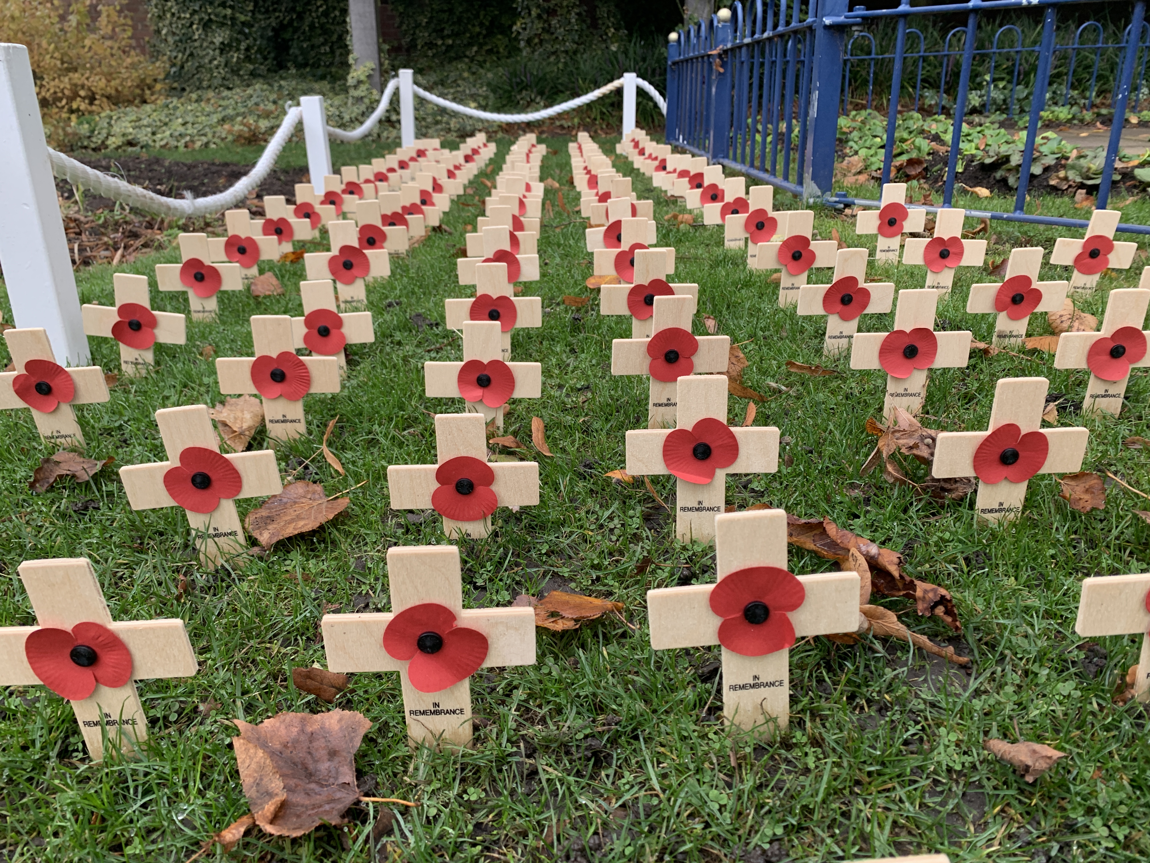 I walk with Zoë through Loughborough’s Queens Park. A roped off area with small wooden crosses, each with a paper poppy and a name on them, placed in rows in the grass. Men from Loughborough. Dead soldiers.