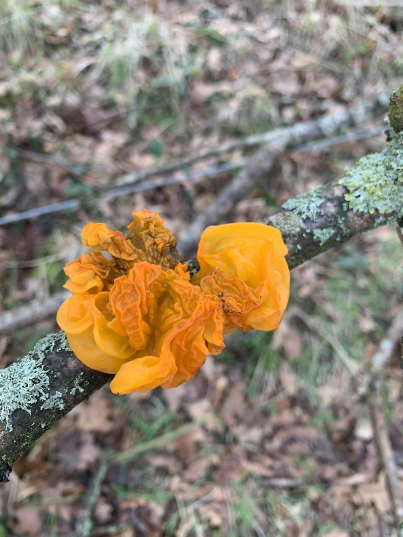 It’s called ‘yellow’ brain fungus but in fact it can vary from a light yellow to as here in Charnwood, on a tree not far from The Outwoods, bright orange.