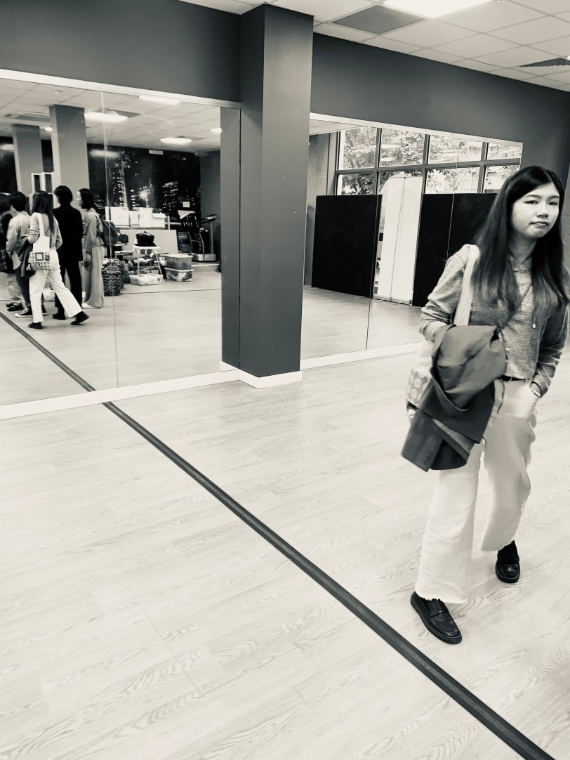 Here we see Taiwanese Art Intern Peiying Lin in the studio of Loughborough Wellbeing Centre when she and her fellow interns, seen here in the mirror, paid a flying visit to it after a day making cyanotypes. The interns are in Loghborough for five weeks along with their mentor Professor Ming Turner.