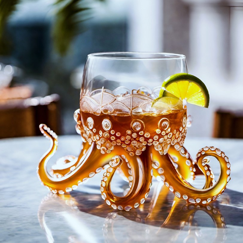 The design of our new Art School Orgy cocktail inspired by Stewart Home’s book of the same name is well under way and currently under wraps with the mixologists at Number 92 in Braintree, Essex. This is not a photograph of The Art School Orgy but of The Octopus a cocktail that required the design and artisan manufacture of an exclusive glass to serve it in.