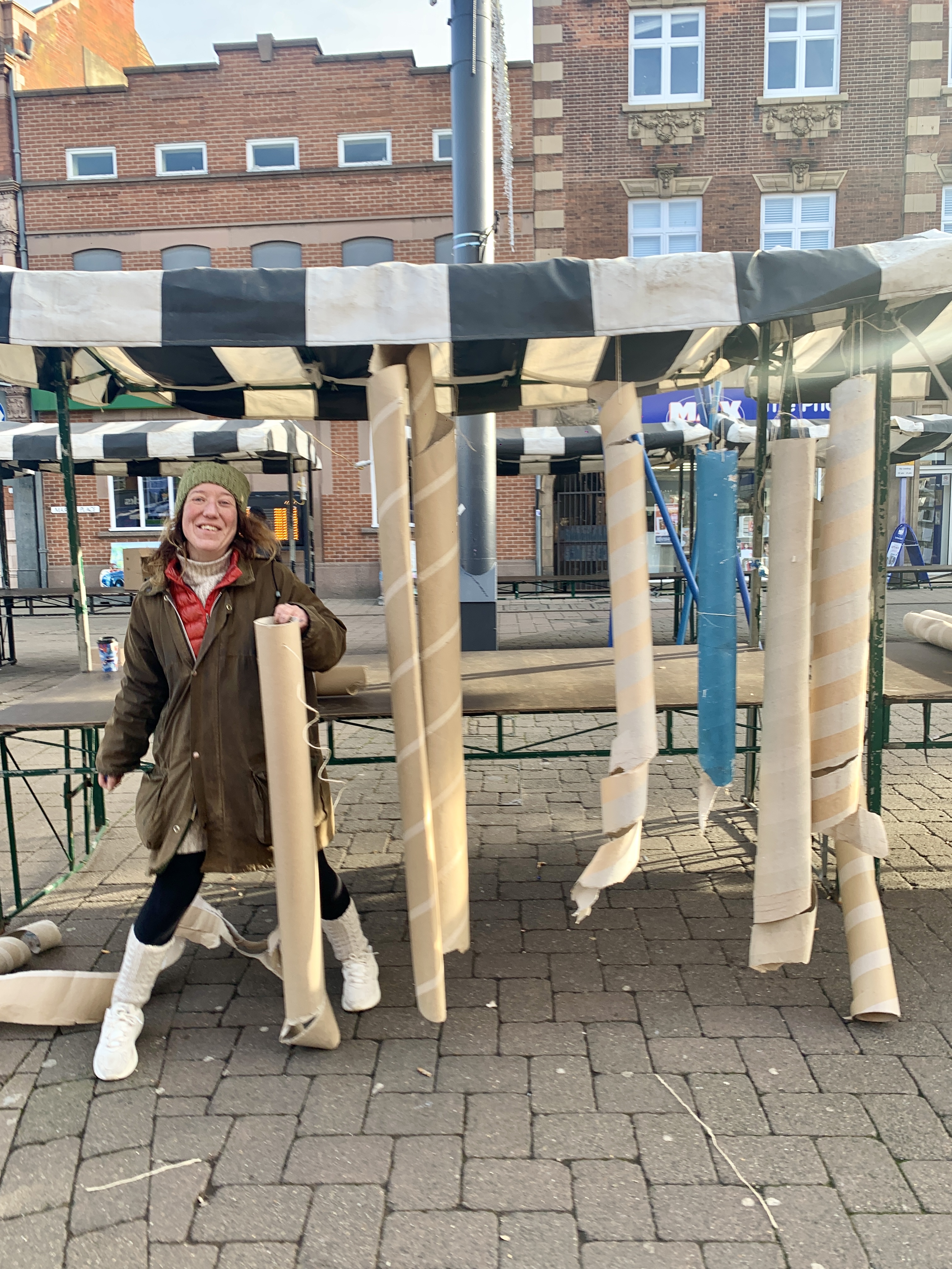 Artist and academic, Dr Miffy Ryan, photographed during her public art intervention residency in Loughborough marketplace as Being Wild Art which she is along with her artistic collaborator artist curator Jacqui Gallon.