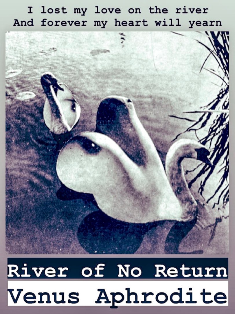 The image here is a classic Karel Teig photo collage. It is used to highlight the musical track by Venus Aphrodite ‘River of No Return’ which is a new version of the song which was originally recorded by Marilyn Monroe for and in the film of the same name.
