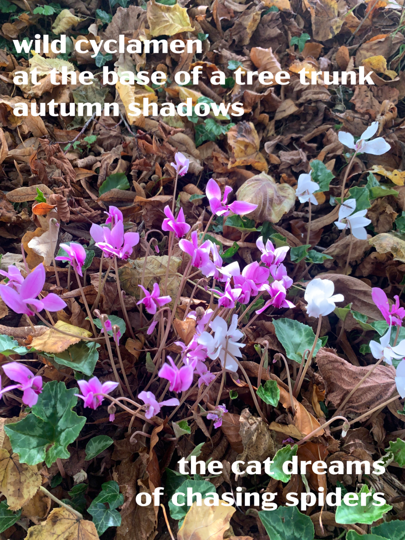 This haiga, or more properly, this photohaiga, to distinguish it from a drawing with a poem and as a photo with one, is by myself and Venus Aphrodite. The photo is of cyclamen growing by a tree along the path up to the church at Calke Abbey in the UK. The poem is a tanrenga. Tanrenga are traditionally the shortest renga the Japanese collaborative poetry proces / form.