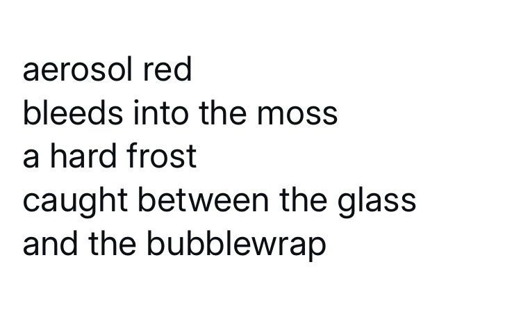 Aerosol Red By Little Onion February 9, 2025 Gavin Wade Paul Conneally renga tanka aerosol red bleeds into the moss a hard frost caught between the glass and the bubblewrap Gavin Wade and Paul Conneally a poem from their never ending series of tanskenga poems (tanrenga written via BlueSky). Share this: Click to share on X (Opens in new window) X Click to share on Facebook (Opens in new window) Facebook Click to share on LinkedIn (Opens in new window) LinkedIn Click to share on Tumblr (Opens in new window) Tumblr Click to share on Pinterest (Opens in new window) Pinterest Like Loading...